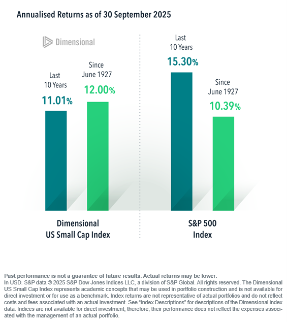 As the below graph demonstrates, the average annualised return of US small caps (measured by the Dimensional US Small Cap Index in USD) has outperformed the S&P500 (large US stocks) by 1.61% per annum for close to one hundred years.