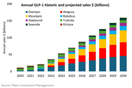 The graph below demonstrates the projected growth of annual GLP-1 sales based on the current largest players within this market. Increasing supply, wider usage and a growing number of new entrants and innovators are expected to drive growth going forward.