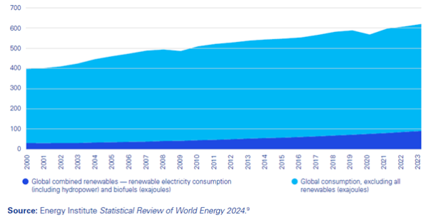 The growth in renewables consumption (dark blue) relative to the total growth in global energy consumption (light blue) underscores both the importance of the transition to more sustainable energy sources, but also the need to ‘keep the lights on’ in the meanwhile.
