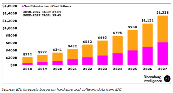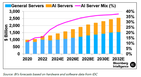 Eventually, generative AI as a service is expected to be a much larger market than servers and data storage with an estimated compound annual growth rate (CAGR) of 54% through to 2032.